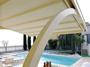 Il modello Arko dispone di un profilo che richiama una struttura raffinata e capaci di creare atmosfere speciali, ideali in particolare per ambienti domestici. Pergotenda® Arko tra i più originali, in quanto non dispone di pali, ma solo del tettuccio di protezione, retto da due bracci sinuosi, come una moderna cappottina.