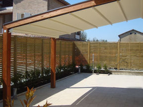 Impact® è il sistema di copertura per pergolato brevettato da Corradi, composto dal telo impermeabile in tessuto Eclissi, che scorre su apposite guide, sostenuto da tubi in alluminio.