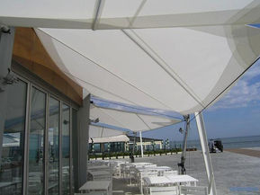 Base zavorrabile 1300x1300 mm (esclusa di piastrelle) con possibilità di fissaggio a terra. La base zavorrabile, in acciaio zincato, è rivestita da un carter in alluminio verniciato bianco (di serie). L’apertura è esclusivamente motorizzata con 1 motoriduttore 230V – 120V, dotato di comando di soccorso, telecomando e anemometro per la chiusura automatica in caso di vento. Le vele sono in dacron bianco (di serie) con stecche di rinforzo in vetroresina. A richiesta sono disponibili anche in dacron color sabbia o ruggine.
